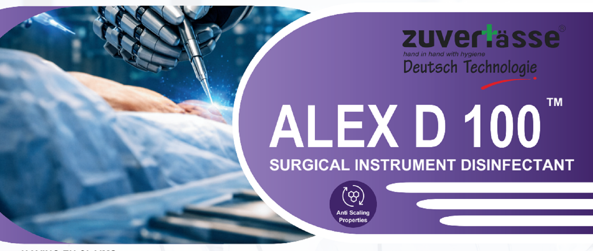 ALEX D 100™ is a powerful and reliable disinfectant specially made for cleaning surgical and medical instruments. Developed with advanced German technology, it kills 99.99% of harmful germs including bacteria, viruses, TB, spores, and other tough microorganisms making it ideal for high-level disinfection. What makes ALEX D 100 truly different is its anti-scaling feature, which helps stop mineral and limescale buildup on instruments. This not only keeps the tools in better working condition but also helps them last longer and reduces the need for repairs. It is perfect for disinfecting all kinds of instruments, such as surgical, orthopedic, dental, anesthetic, robotic tools, catheters, endoscopes, and other delicate or heat-sensitive devices. Before using ALEX D 100 make sure to clean and rinse instruments thoroughly with tap water (with hardness less than 400 ppm). Always prepare a fresh solution every day, and replace it if it becomes dirty or diluted to ensure the best results and safe use.