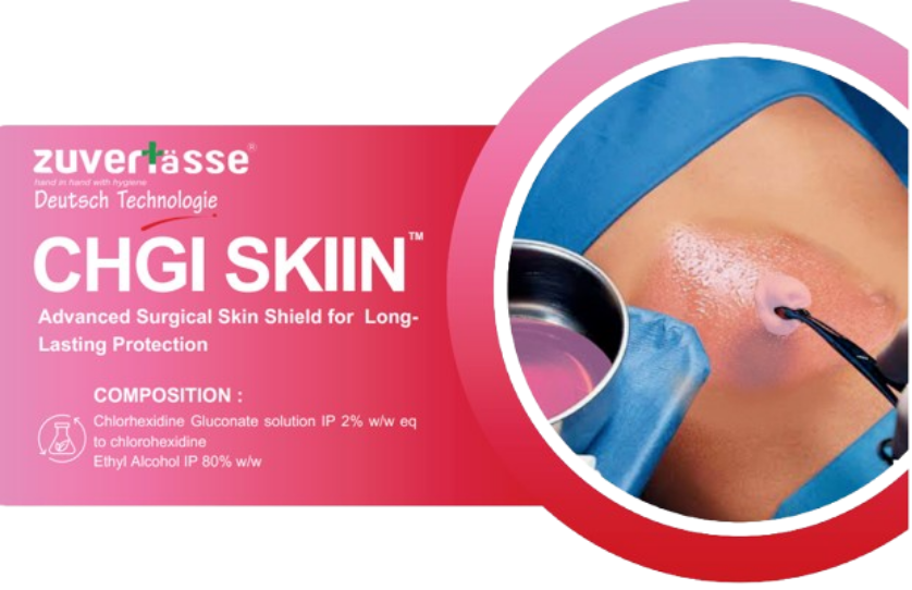 CHGI SKIIN™ is applied before surgery to create a germ-free surface, reducing the risk of infection. After surgery, it helps prevent microbial growth, promoting faster healing and recovery. Additionally, it serves as a general antiseptic, providing an extra layer of protection during various medical procedures.