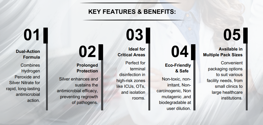 Z SILVER™Eco is a next-generation, aldehyde-free surface and environmental disinfectant formulated with a powerful dual-action of Hydrogen Peroxide which rapidly destroys the cellular components of microorganisms through oxidative stress and Silver Nitrate which enhance and prolong the antimicrobial activity of hydrogen peroxide by destabilizing microbial cell walls and interfering with their enzyme systems. Even in low concentrations, silver acts as a powerful and long-lasting antimicrobial agent, preventing the regrowth of pathogens on treated surfaces. This advanced blend ensures rapid and broad-spectrum antimicrobial efficacy. Ideal for terminal disinfection in critical care areas like OTs, ICUs, etc it offers fast-acting, long-lasting protection while remaining non-toxic, non-irritant, non-carcinogenic, non mutagenic and eco-friendly at user dilution making it a trusted choice for modern, high-standard healthcare hygiene.